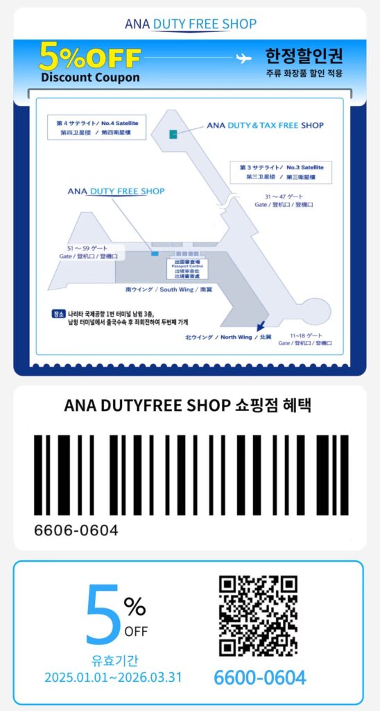여행할인 📤 나리타(도쿄)공항면세점 할인쿠폰 도쿄 나리타공항 제1터미널 내의 ANA면세점에서 사용가능한 5% 면세점 할인쿠폰입니다! 해당되는 품목은 화장품과 주류(사케, 위스키, 와인 등)에 한정되며,관광객을 위한 할인쿠폰이므로, 여권을 반드시 소지 후 사용하시길 바랍니다.