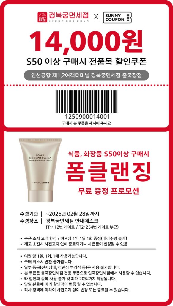 수령장소: 경복궁면세점 안내데스크 (T1: 12번게이트 / T2: 254번 게이트 부근)