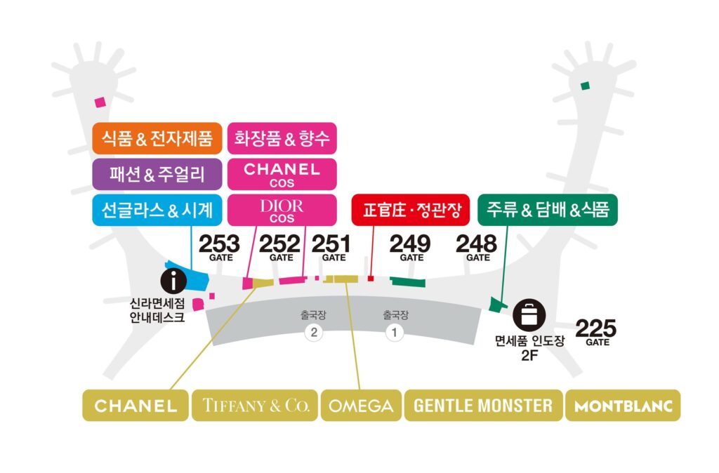 – 2번 출국장 : 패션 BTQ (251번 게이트), 패션/액세서리(253번 게이트)